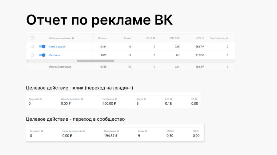 Рекламная компания не сработала, необходимо пересмотреть креативы — добавить больше интерактива, необходим более продуманный, выразительный и яркий визуальный стиль. В первую очередь сосредоточиться на еще более молодой аудитории 24-35 лет (более склонны пробовать что-то новое), а также протестировать другие паблики, связанные с домашними животными.