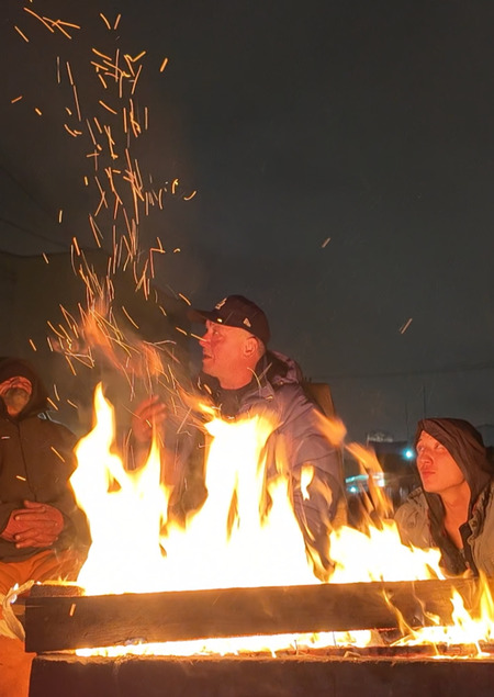 Зритель наблюдает за бездомными у костра на протяжении долгого времени. Это видео без слов погружает зрителя в другую реальность, переосмысляя отношение к «невидимым» людям. Благодаря костру, который является не только источником света, но и метафорой тепла и человеческого общения, мы, зрители, становимся свидетелями их жизни. Через это смотрение мы, зрители, можем сблизиться с этими людьми — сделать их хотя бы отчасти видимыми.