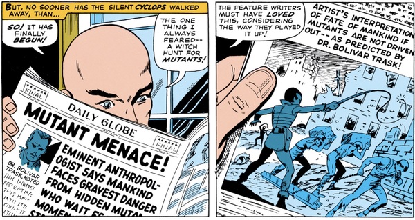 Для того, чтобы показать конфликт героев и общества, авторы часто сталкивают иксменов лицом к лицу с людьми на улице, которые относятся к мутантам с недоверием и видят в них угрозу. Подобные эпизоды сейчас выглядят довольно просто и поверхностно, однако их не хочется судить слишком строго, ведь это были первые попытки показать, как человечество воспринимает тех, кто на него непохож.