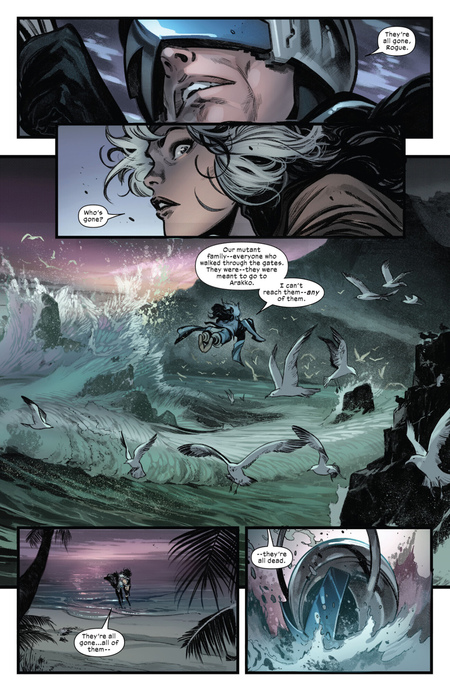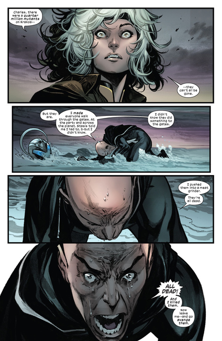 По-настоящему шокирующей становится концовка истории, когда члены Орхиса путем шантажа заставляют Профессора Икс увести с Земли четверть миллиона мутантов через ворота Кракоа, однако оказывается, что все, кто прошел через них, погибли. Это действительно мрачный финал, который отличается от раннее показанных геноцидов мутантов, ведь на этот раз орудием в руках антагонистов стал их главный наставник и лидер, сам основатель Людей Икс.