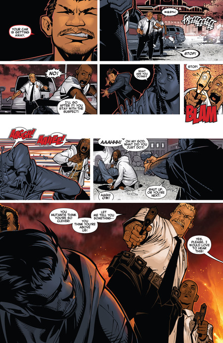 Еще одним новым мутантом становится Дэвид Бонд, чьи способности проявляются во время ссоры с девушкой, которая от испуга моментально раскрывает его перед прибывшей на место полицией. Мы уже видели примеры того, как изображалось столкновения мутантов со служителями закона в 60-е и 80-е года, и можем наблюдать, насколько в этой теме расширилась творческая свобода авторов — типаж плохого полицейского теперь стал нормой.