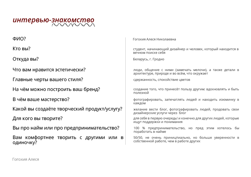 Этот проект посвящён моему анализу себя, своей внешности, своих воспоминаний и своих продуктов. Не всегда это нам даётся легко, но именно на этом и нужно строить свой бренд. Глубокое понимание себя и своих приоритетов позволяют в будущем создать сильный и уникальный личный бренд, со своими стилевыми особенностями и с той самой изюминкой.