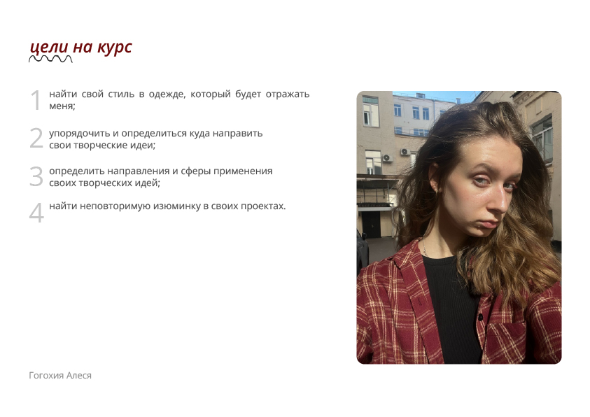 Мой запрос на курс — найти свой стиль в одежде, понять в какую сторону двигаться, учитывая свои творческие идеи и найти изюминку в своих проектах. По окончанию курса у меня получилось найти две стороны своего проявления в образах — «Арлекин» (предложено преподавателем курса Музалевской Ириной Михайловной) и «Эхо прошлого». Теперь я могу сочетать это, вдохновляться какими-то особенностями и отражать индивидуальные черты в своих проектах. Я также смогла определиться в какую из сфер я хотела бы сейчас уйти больше (на что также повлиял курс) и я смогла поставить себе цели для осуществления своей мечты. Курс помог мне глубже понять себя, найти свою уникальность и ту самую изюминку, про которую я писала в запросах на курс.