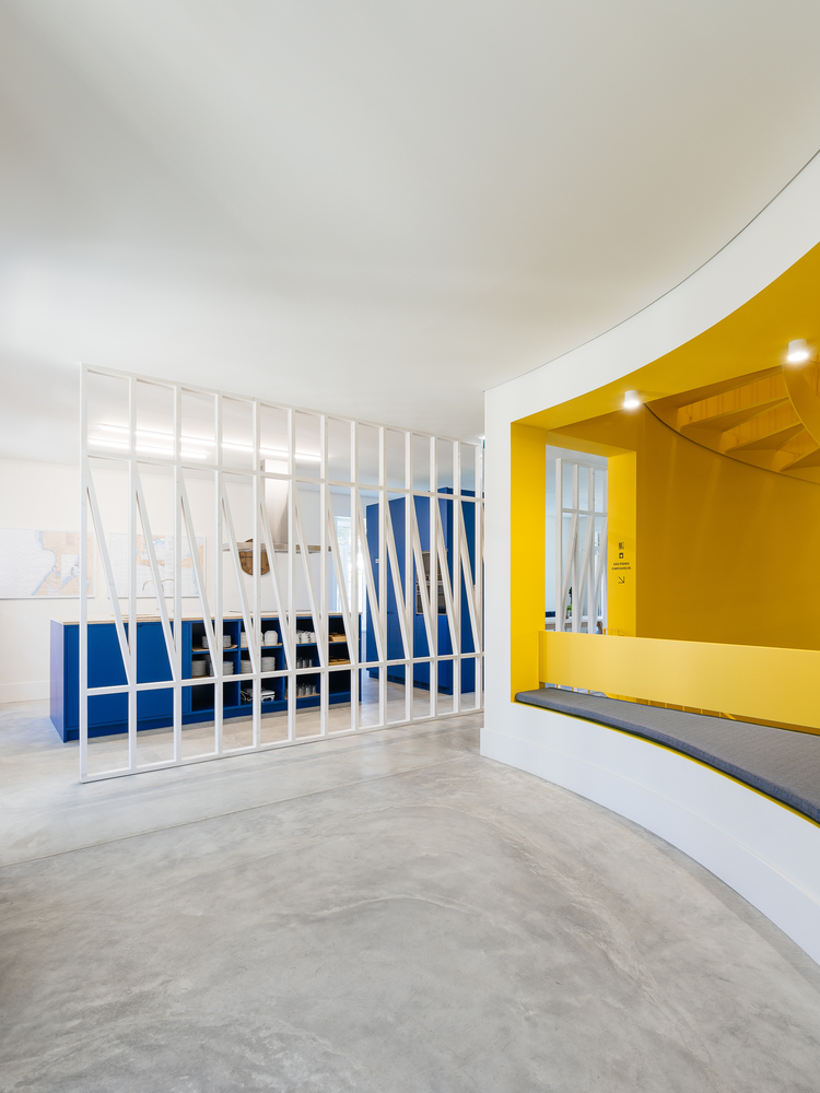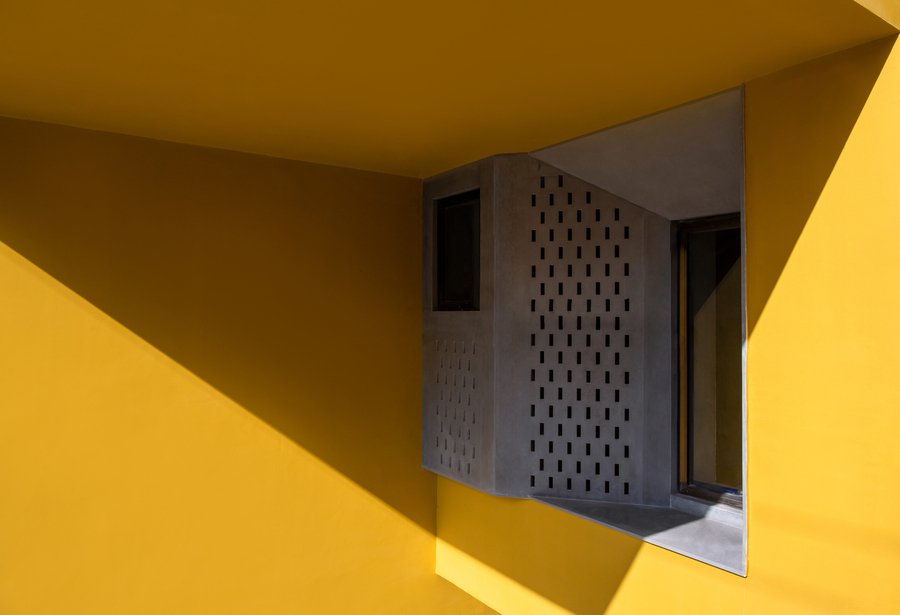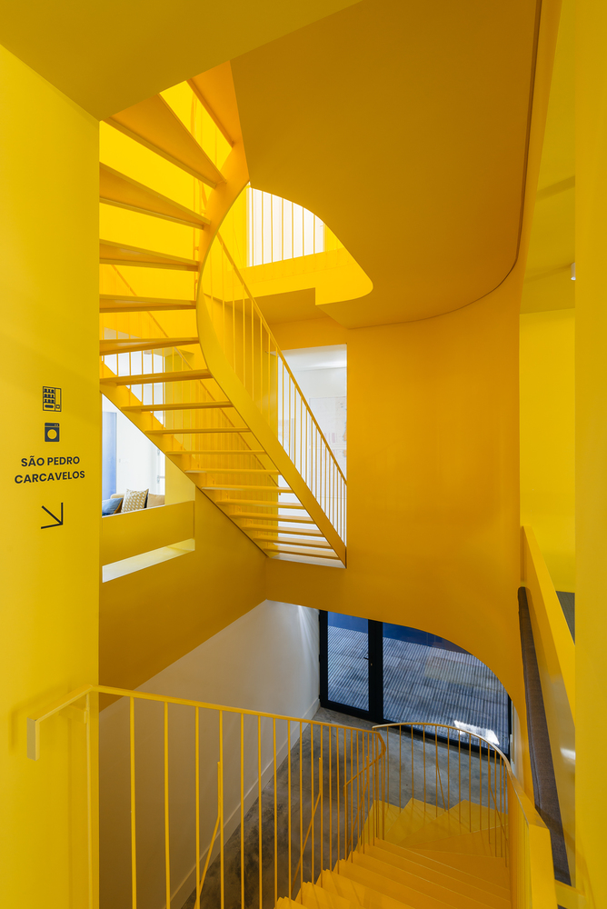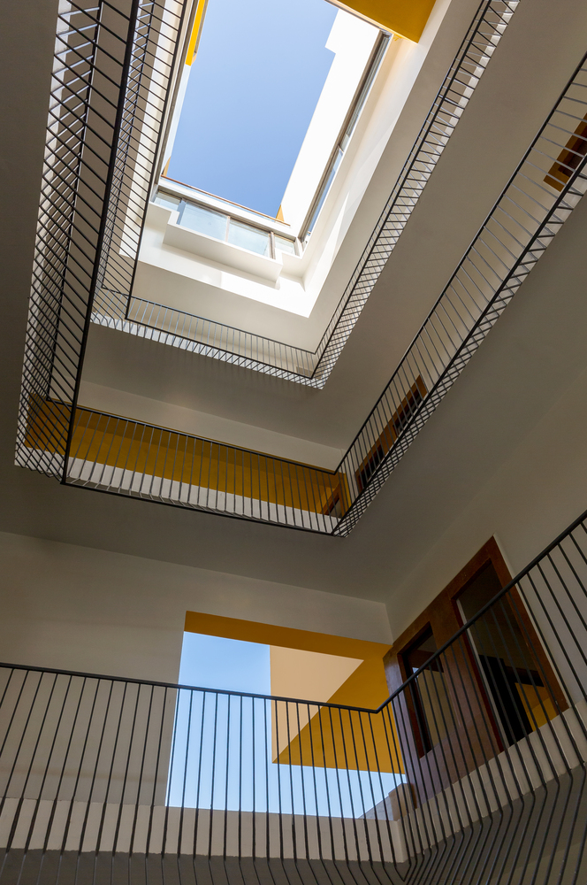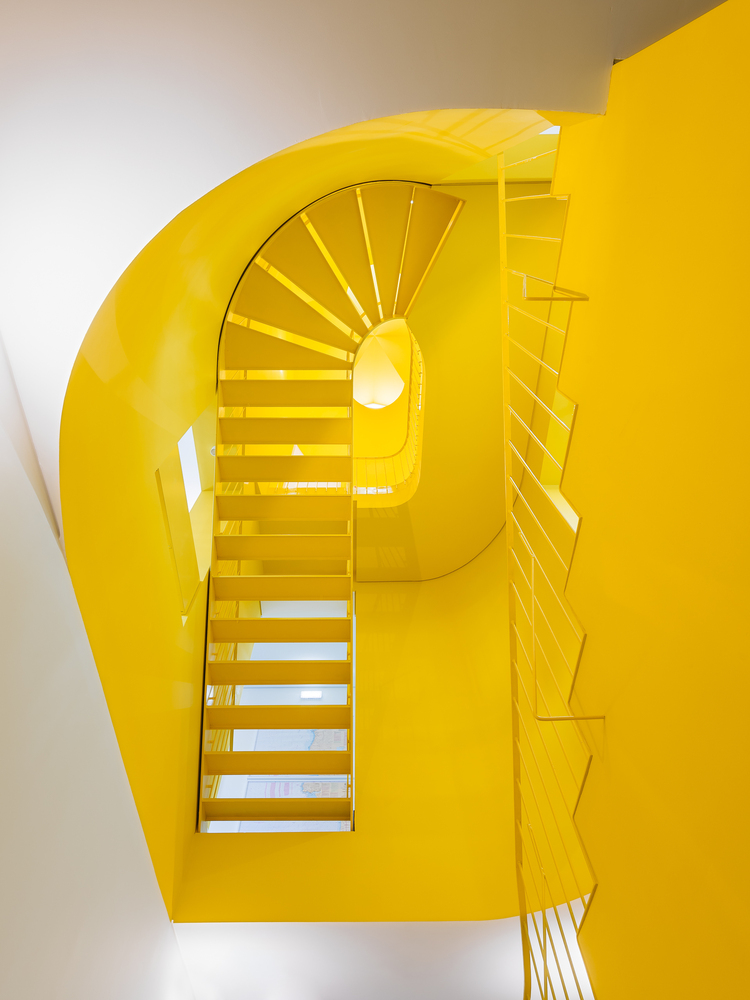 Интерьер этого здания находился в полуразрушенном состоянии, но, несмотря на это, его крыша все еще стояла. Его сложная геометрия с четырьмя угловыми пирамидальными объемами определила структуру проекта и внутренние перегородки, разделив план на 9 модулей. В центральном модуле лестница соединяет три этажа, наполняя пространство своим желтым сиянием и естественным светом, идущим сверху. Его резко закругленные углы скрытно несут в себе все вертикальные службы здания.