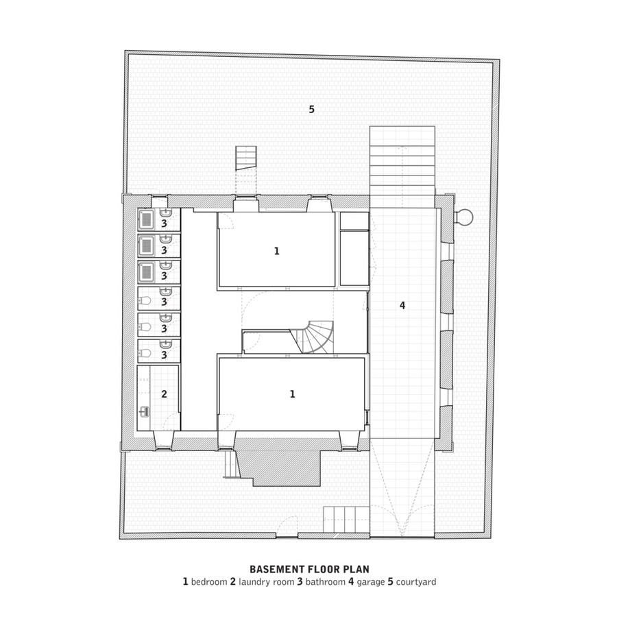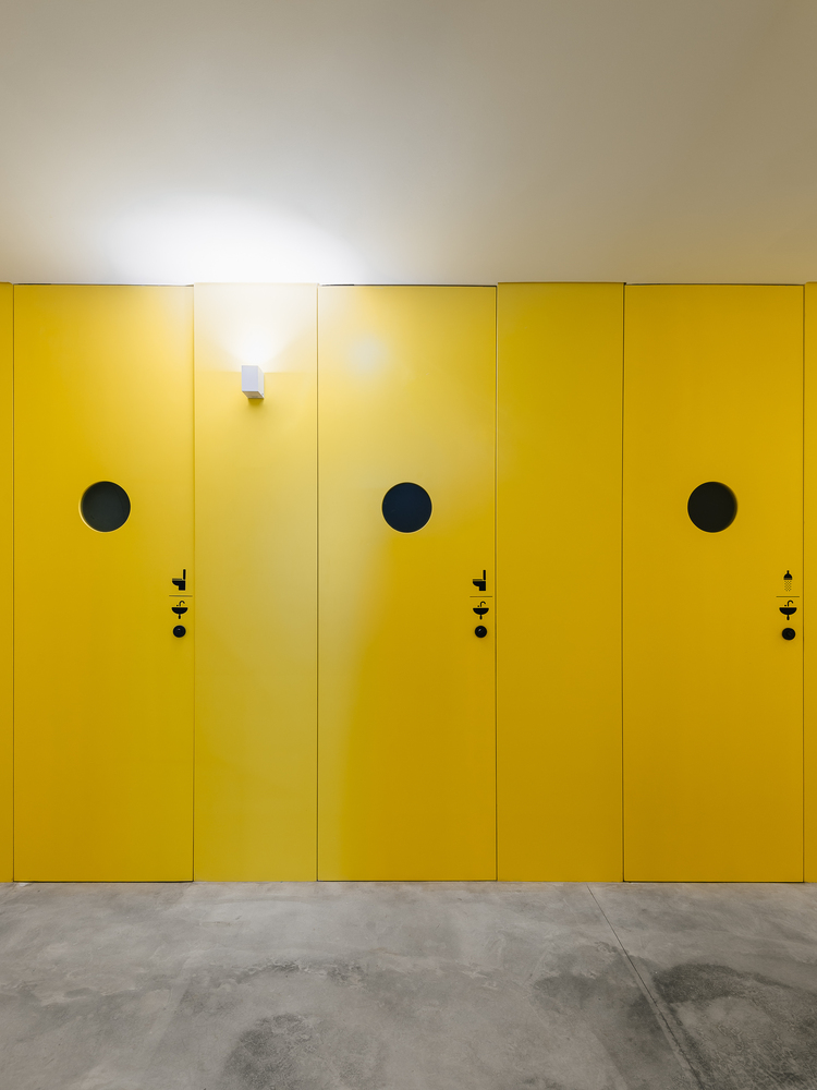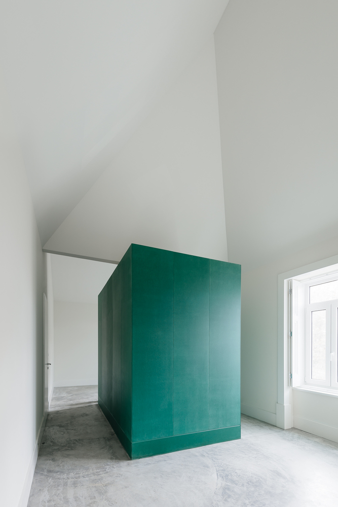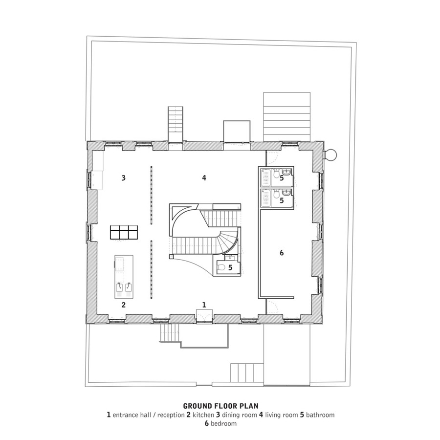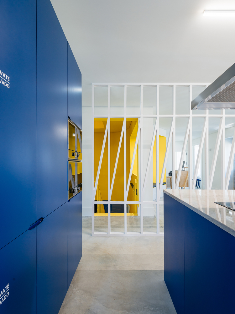 Интерьер этого здания находился в полуразрушенном состоянии, но, несмотря на это, его крыша все еще стояла. Его сложная геометрия с четырьмя угловыми пирамидальными объемами определила структуру проекта и внутренние перегородки, разделив план на 9 модулей. В центральном модуле лестница соединяет три этажа, наполняя пространство своим желтым сиянием и естественным светом, идущим сверху. Его резко закругленные углы скрытно несут в себе все вертикальные службы здания.