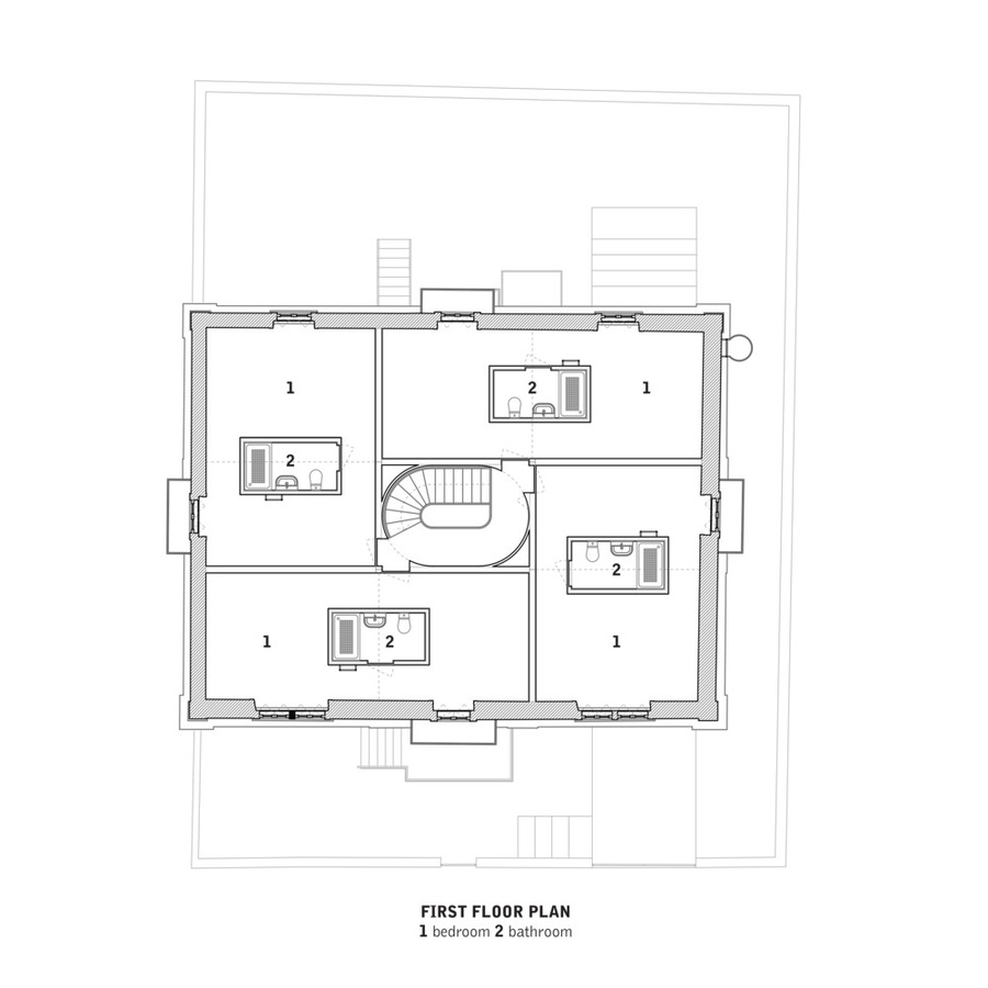 Общая структура здания также основана на логике легкой будущей трансформации. Основная несущая решетка состоит из ламинированной стали с легким стальным каркасом в плитах и стенах. На верхнем этаже расположены 4 спальни, каждая с отдельной ванной комнатой.