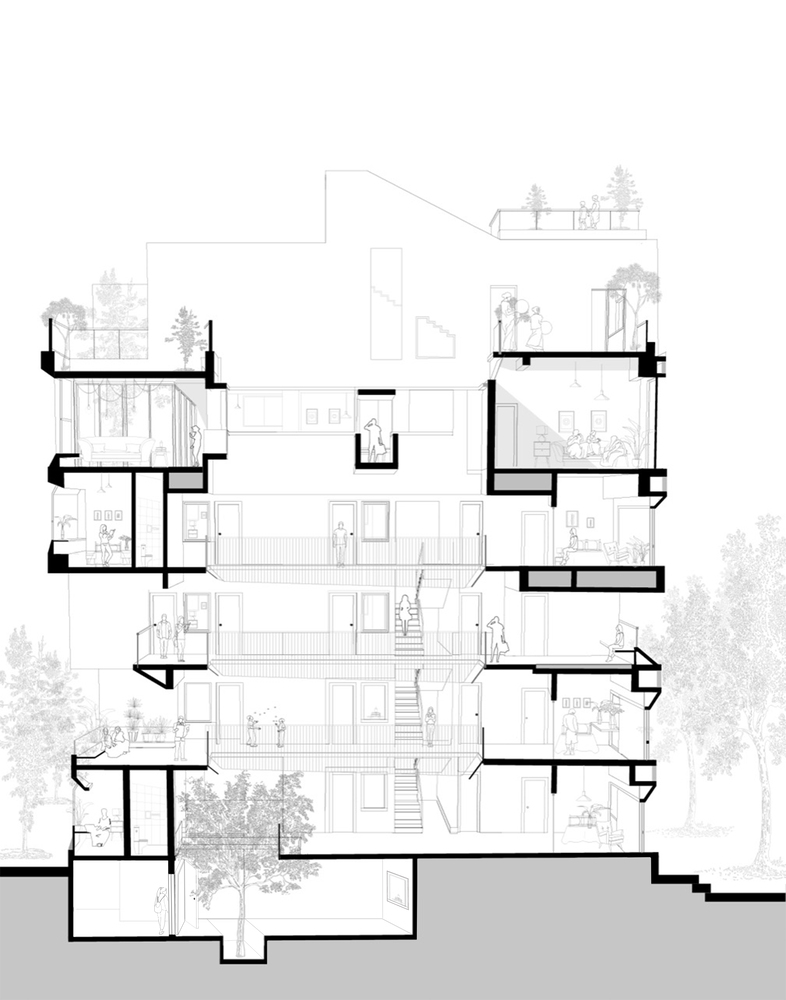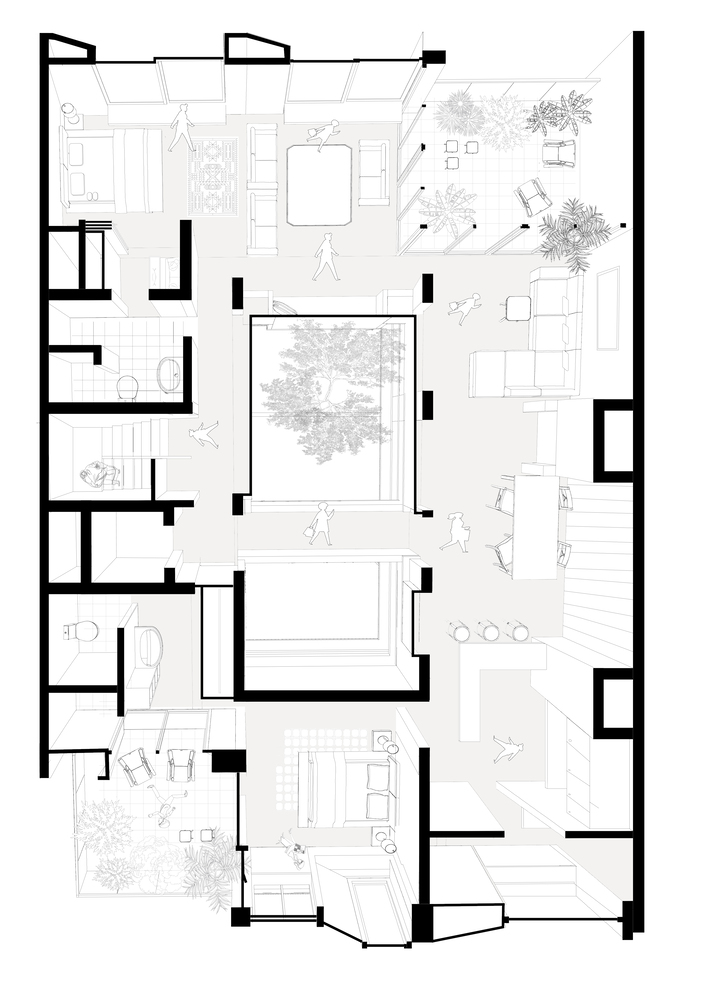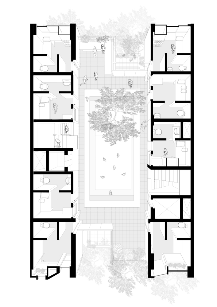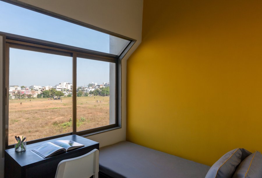 Сочетание социального пространства террас и дворов создает аэродинамическую трубу, позволяющую ветерку проходить через здание. Открытый двор над небом перекинут мостом, соединяющим два плеча жилого дома владельцев. Здание структурировано через несколько ступенчатых террас с затененными социальными пространствами, позволяющими студентам создать визуальную связь между другими уровнями, а также с улицей и двором.