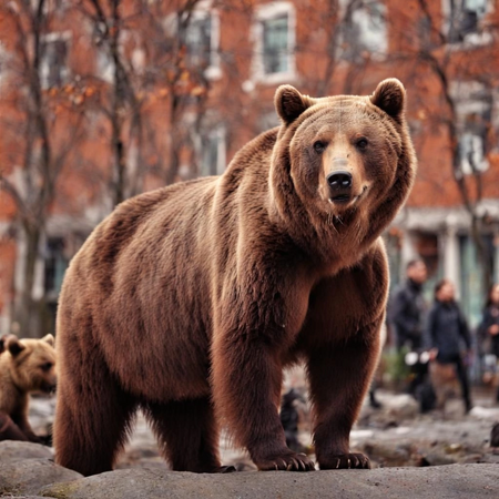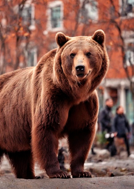 Здесь нейросеть решила добавить людей на фон, а также медвежонка, но все получилось хорошо, особенно мне нравятся яркие красные акценты, которые подчеркнули красивую шерсть медведя
