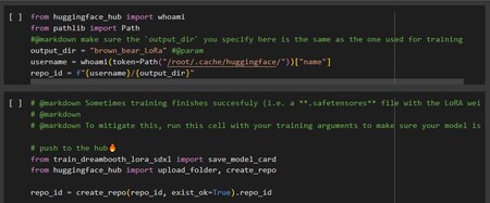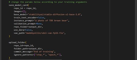 Здесь я использовала команду, которая запускает процесс, где я дообучаю модель, чтобы она генерировала картинки в нужном мне стиле. Сначала подгружается базовая модель с нужными ресурсами, а затем ей показывают набор примеров картинок с описаниями, чтобы она научилась создавать новые работы в этом стиле