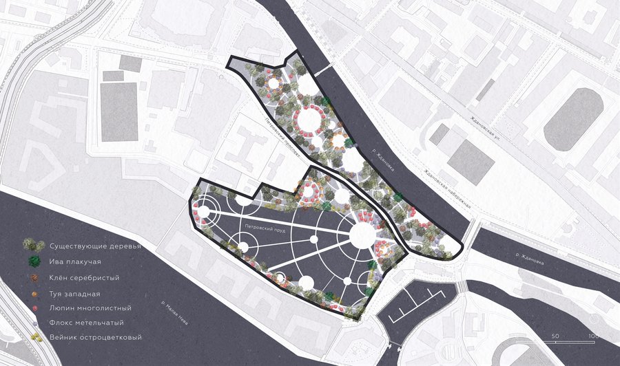 Это парк, представляющий собой метафору вспышки звезды, воплощённый в супрематическом духе. Центральная композиция парка — огромный круг, символизирующий эпицентр рождения звезды. От него расходятся радиальные линии, образованные дорожками, аллеями и зелёными насаждениями. Эти линии напоминают выбросы энергии и материи во время рождения звезды.