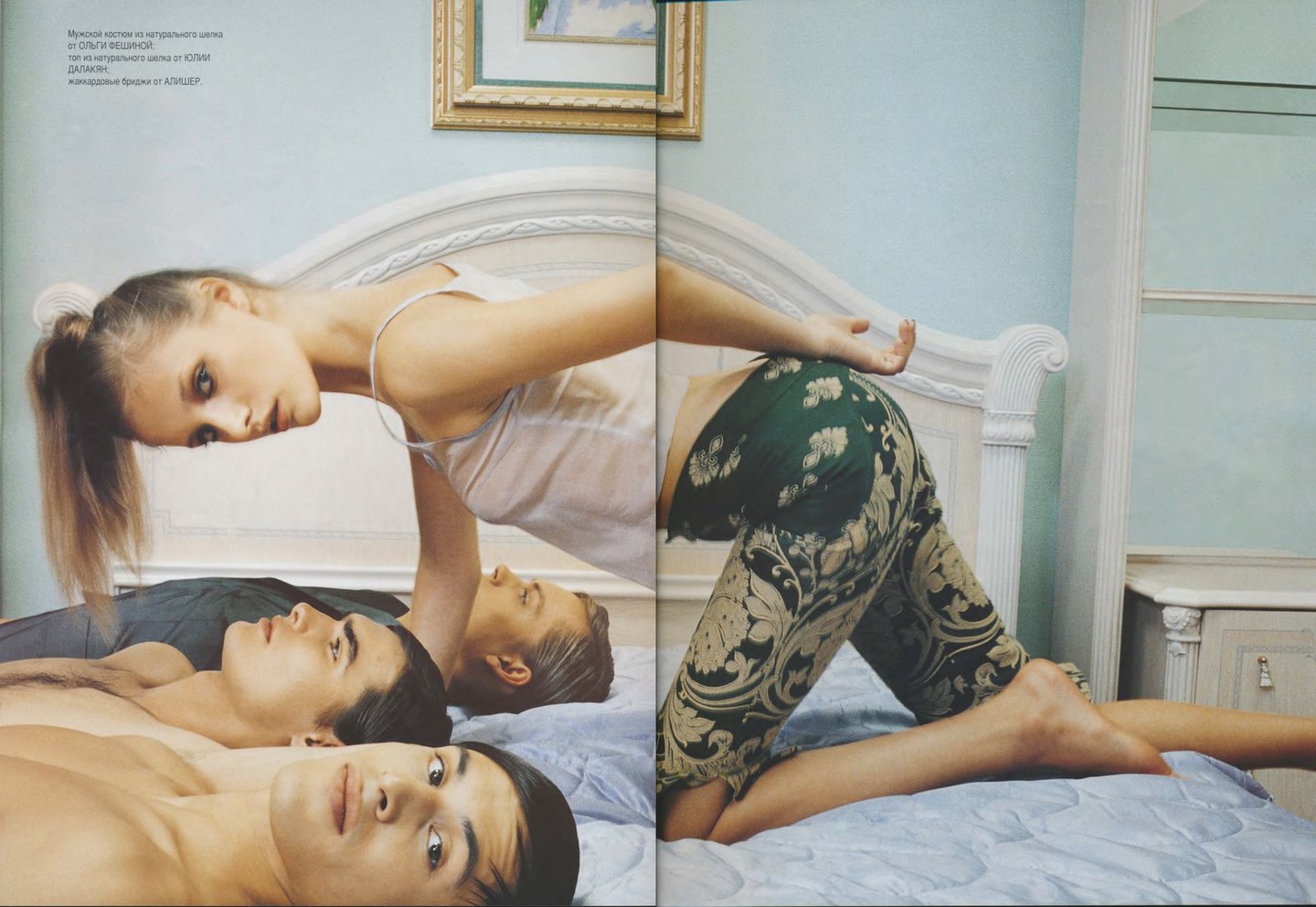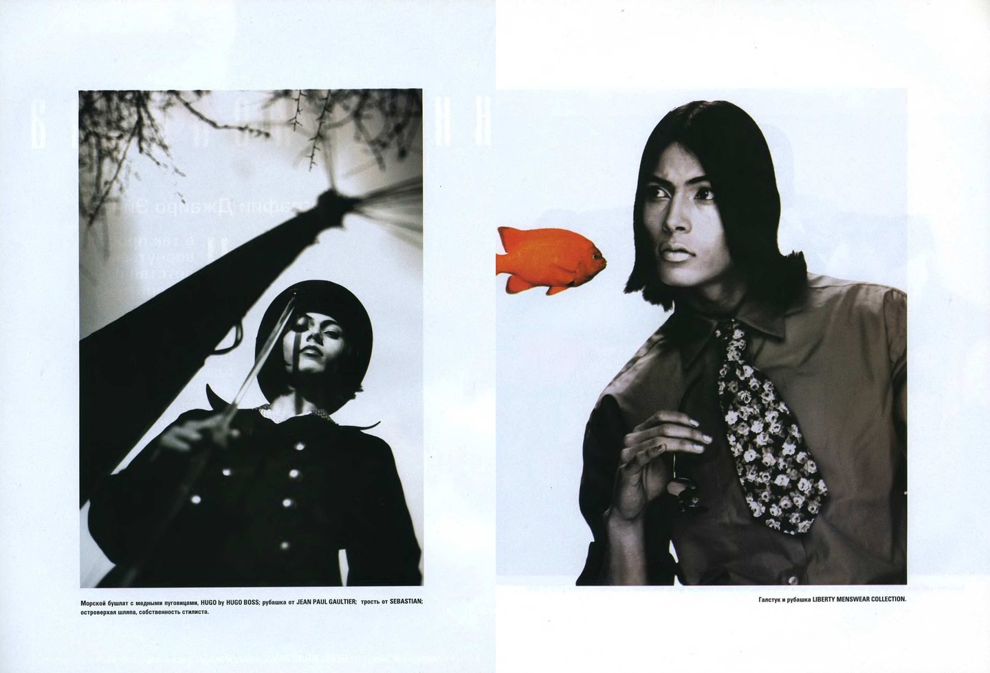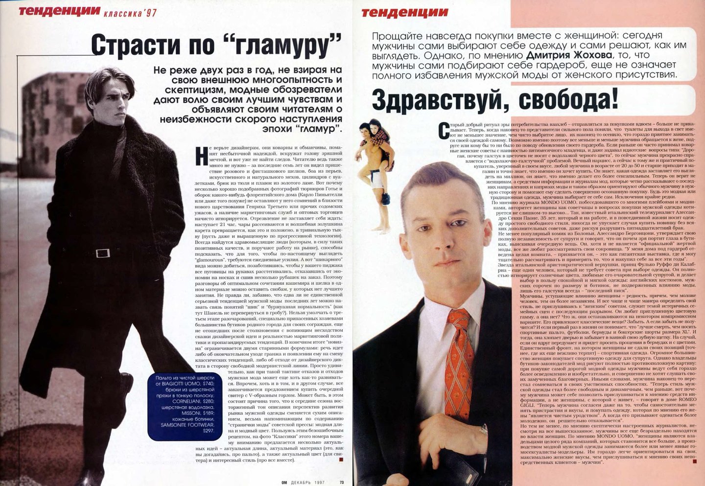 Конечно, о моде в журнале не только рассказывали, но и показывали ее. Несмотря на то, что редакторы «ОМа» описывают свою аудиторию довольно широко, важным отличием от большинства выходивших на тот момент в России изданий был акцент на мужской моде и красоте. И, если в новостях и отчетах с презентаций можно было встретить имена дизайнеров, создававших одежду для женщин, то в съемках мы видим в основном одежду мужскую, которую в условиях только появляющегося модного рынка достать было почти невозможно. Но стилистам «ОМа» это удавалось.