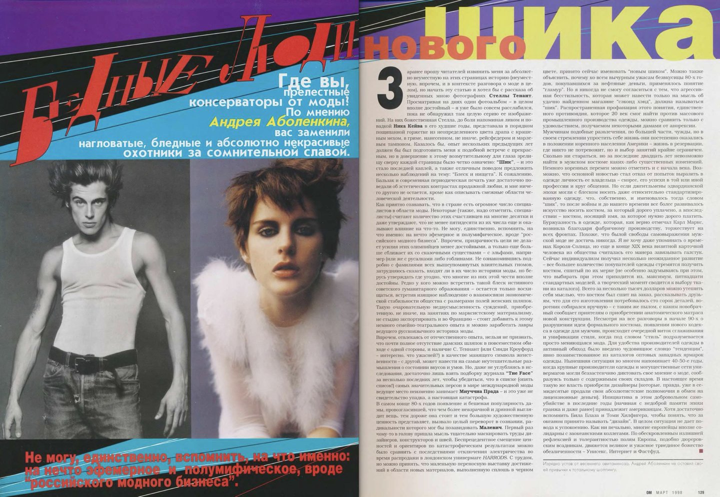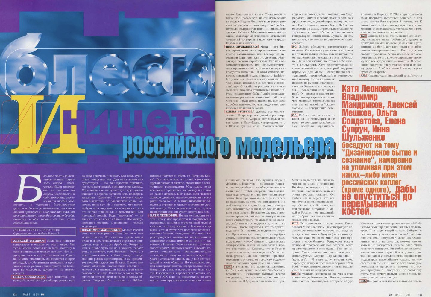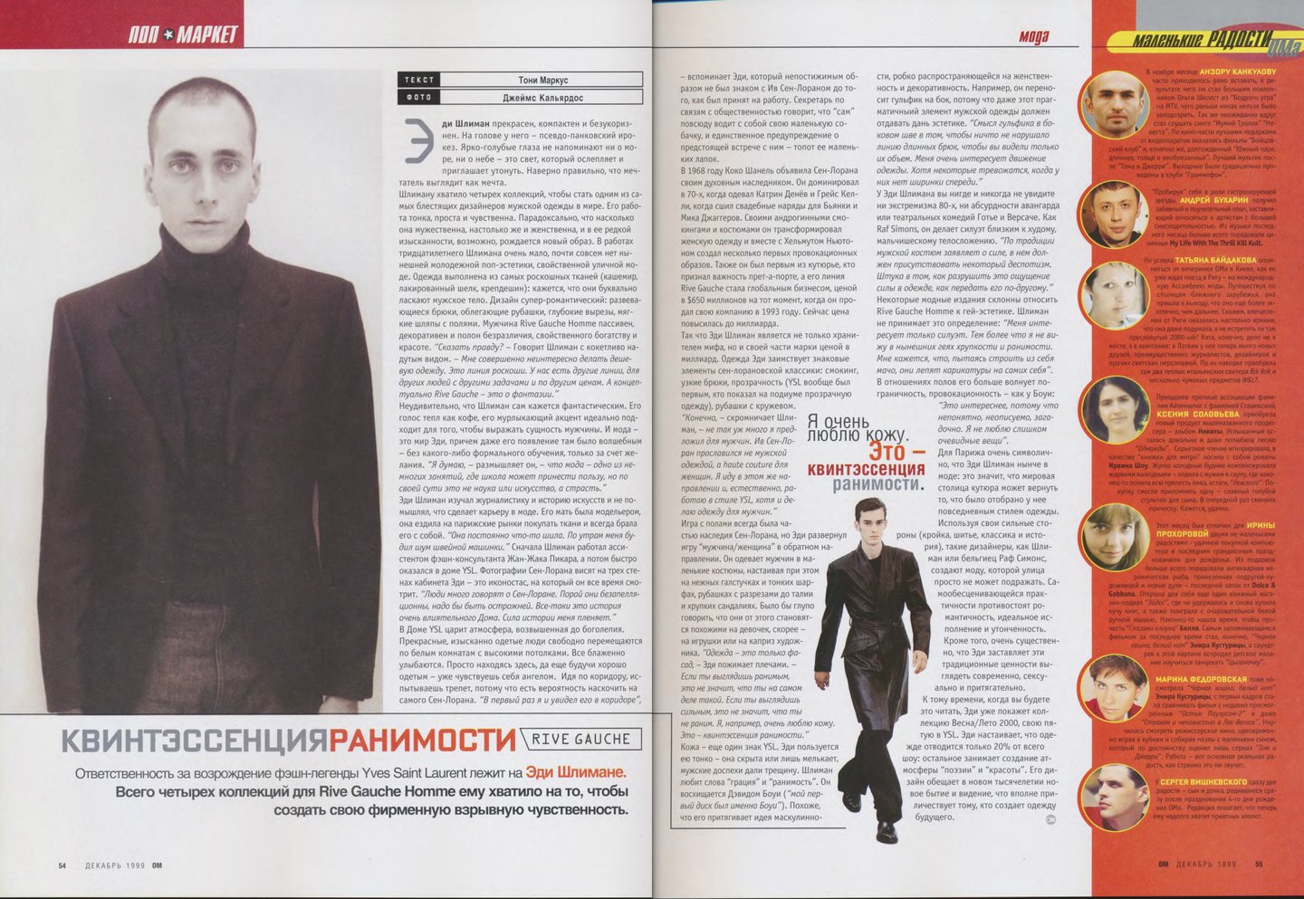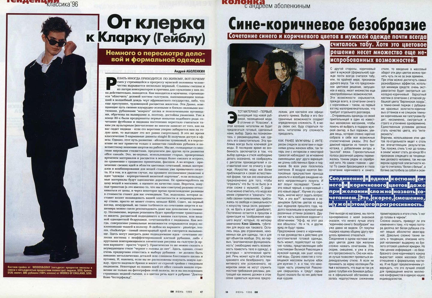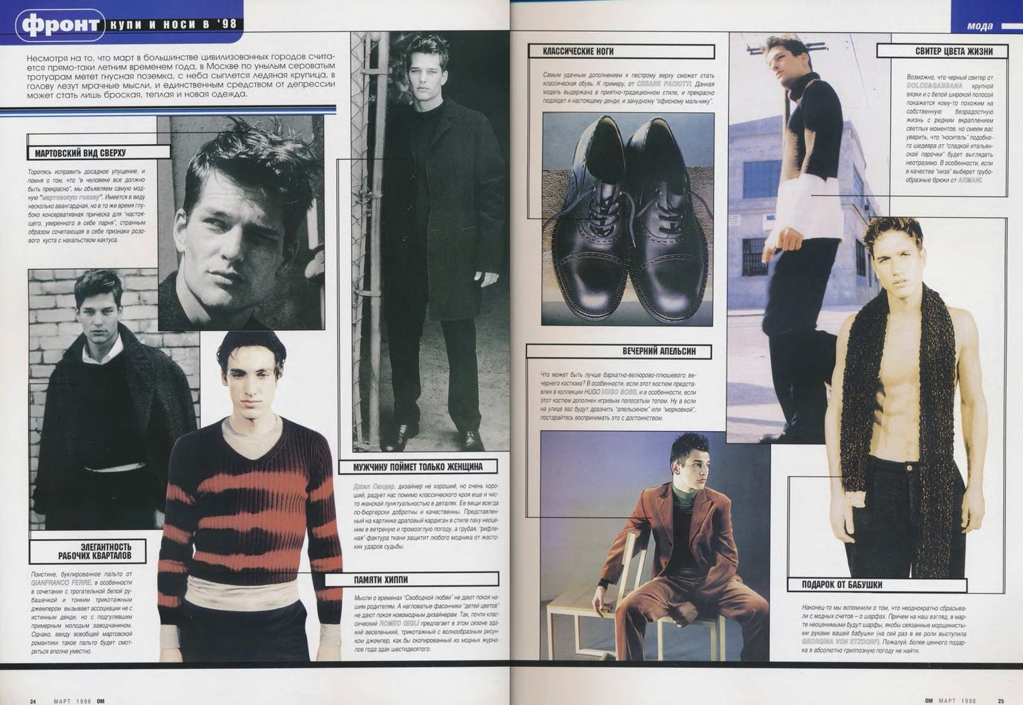 Кажется, что материалов о российской моде в «ОМе» было сравнительно меньше, чем, например, в «Птюче». Все-таки журнал уделял внимание в первую очередь тому, что можно было легко купить и носить, одежду российских дизайнеров, тем более мужскую достать было непросто.