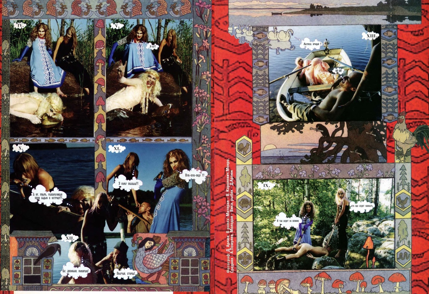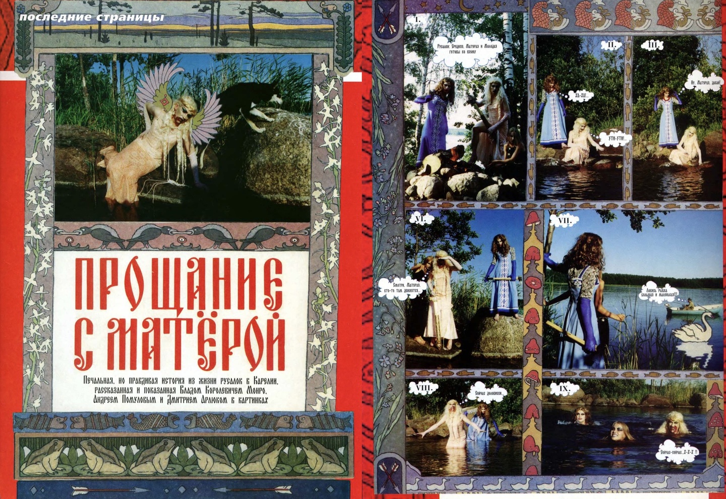 Закончим материал съемкой, которая смотрится актуальной даже по меркам 2020-х, сочетая в себе коды локальной культуры и коллажный формат. «Прощание с Матёрой — печальная, но правдивая история из жизни русалок в Карелии, рассказанная Владом Королевичем Монро, Андреем Полумовым и Дмитрием Арлюком в картинках».