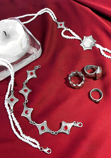 Основные элементы — острые углы, красные камни, жемчуг и образ зеркала.