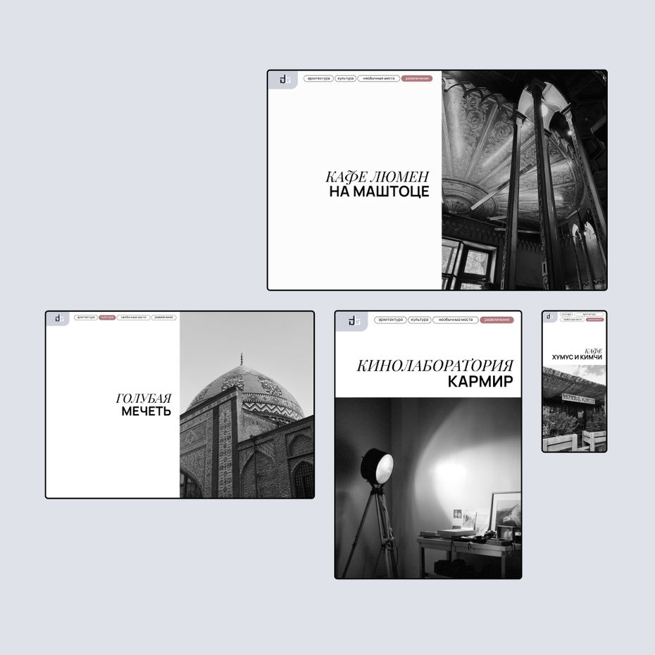 Суть проекта — онлайн-платформа по интересным местам в Ереване. Называется Two Sides of Yerevan. Там собраны локальные, не очень популярные места, достаточно сложно находимые, особенно для тех, кто только приехал в Ереван. Разумеется, меня это заинтересовало. Я ещё начала работать в Вышке, и мне хотелось что-то сделать для Еревана, поэтому мы вместе с моими коллегами-дизайнерами взялись за проект — и он тоже был очень классный и интересный. Более того, он был более творческий, нежели коммерческий, посвященный не бизнесу, а образованию и развлечениям. Было приятно окунуться в атмосферу Еревана, работая с фотографиями, историями, текстурами, которые должны передавать атмосферу города. Когда берёшься за проект, начинаешь во всем этом копаться и, естественно, это очень вдохновляет, поэтому после этого проекта, после того, как я начала работать в Вышке, у Еревана появилось на меня определенное влияние. Посмотрим, как это будет дальше проявляться.
