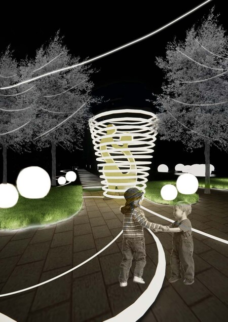 Проект «Единение целого» представляет собой впечатляющую световую инсталляцию, где световые линии, начиная на пешем участке аллеи, обрамляют фигуры матери и сына, символизируя глубокую связь и силу материнской любви. Это визуальное представление единства создает впечатляющий эффект, подчеркивая тему взаимной привязанности.
