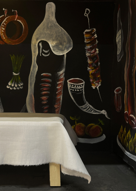 В центре витрины будет размещен один большой белый стол, с белой скатертью, на котором ничего не будет. Этот пустой стол символизирует жизнь Пиросмани, которая была крайне бедна и одинока, несмотря на его выдающийся художественный талант. Это как бы показывает нам, что внешний вид иногда может не соответствовать реальности.