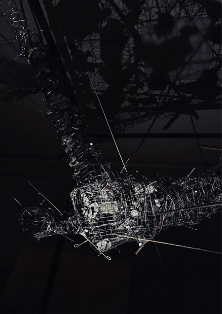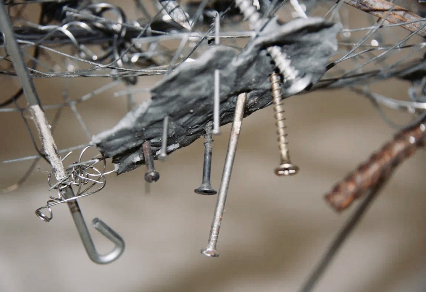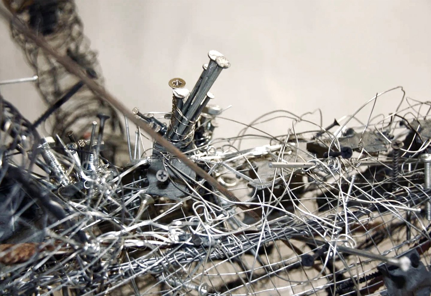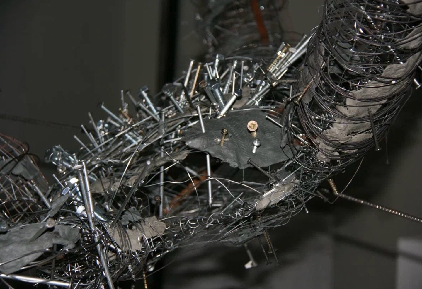 Инсталляция состоит из: - рабочего, сделанного из проволоки, глины, вколотых в него гвоздей, болтов; его рост — 1,7 м - деревянного куба, размером 1,5 м х 1,5 м х 1,5 м - канатов, за которые рабочий подвешен к кубу