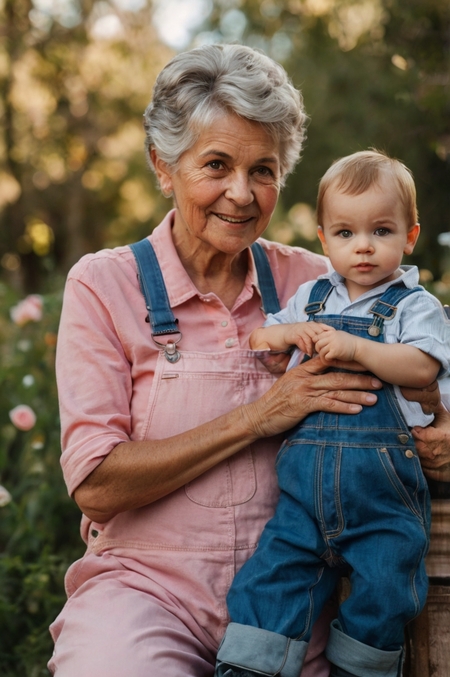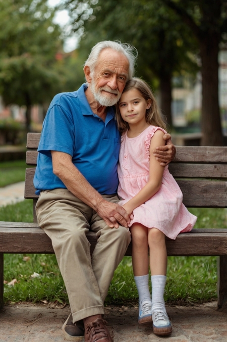prompt for pic. № 3: generate an elderly woman in a pink jumpsuit holding her grandson prompt for pic. № 4: generate an old man in a blue T-shirt sitting on a bench next to his granddaughter