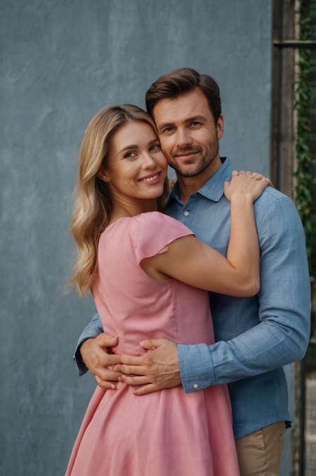 Prompt for cover: generate a woman and a man hugging. the woman was in a pink dress and the man was in blue clothes.