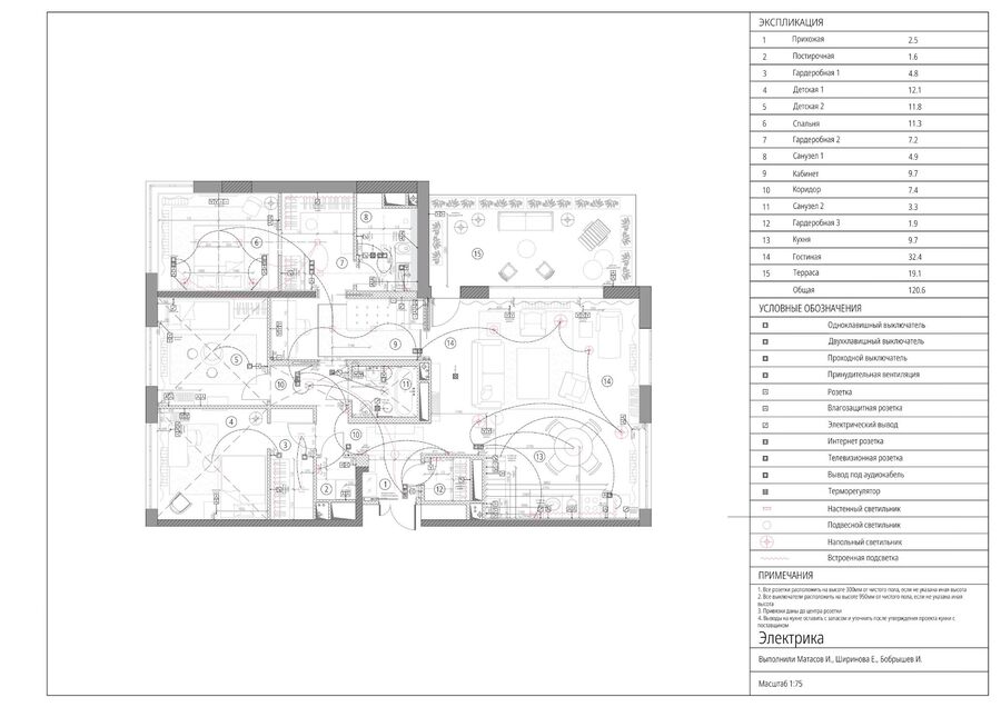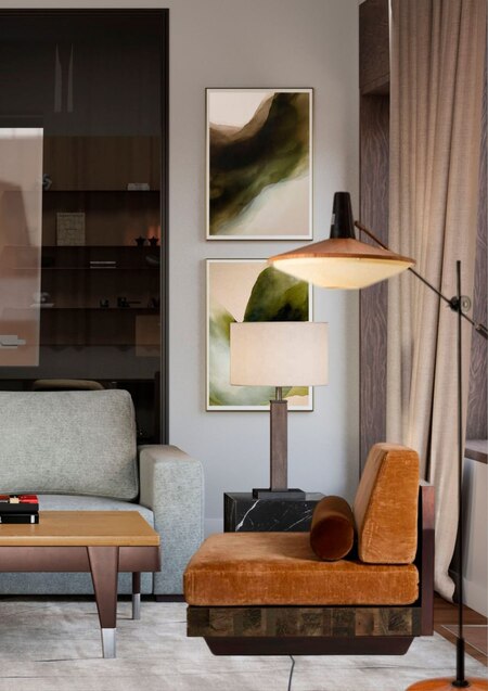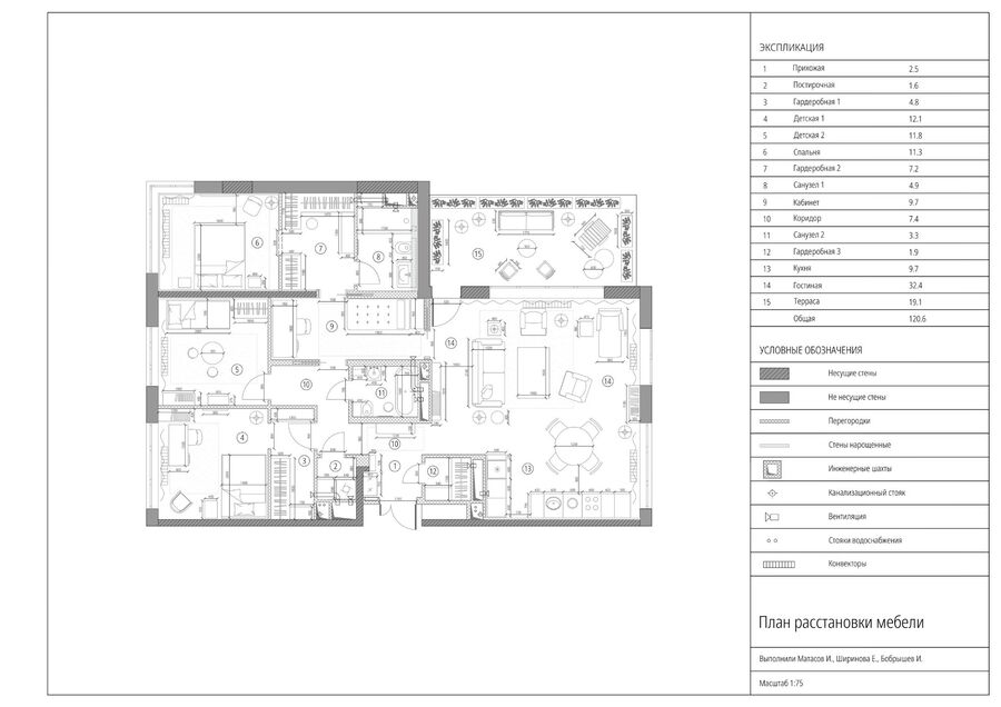 Просторная квартира с террасой для семьи. Пространство квартиры делится на две основные зоны: приватную часть со спальнями для членов семьи, и социальную — единое пространство кухни-гостиной с выходом на террасу. Соединяет две зоны кабинет. Для акцента в интерьере использовали винтаж, нестандартную, с интересными деталями и функциональную мебель.
