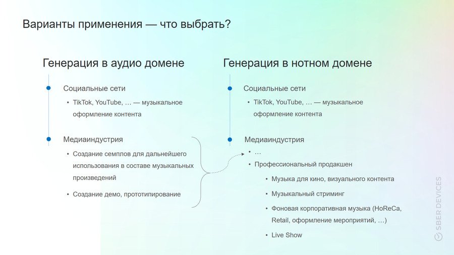 SberDevices — подразделение Сбера, которое занимается разработкой девайсов и различных систем искусственного интеллекта абсолютно в разных направлениях. У SberDevices есть также отдел управления экспериментальных систем машинного обучения, в котором работает команда генеративной музыки.