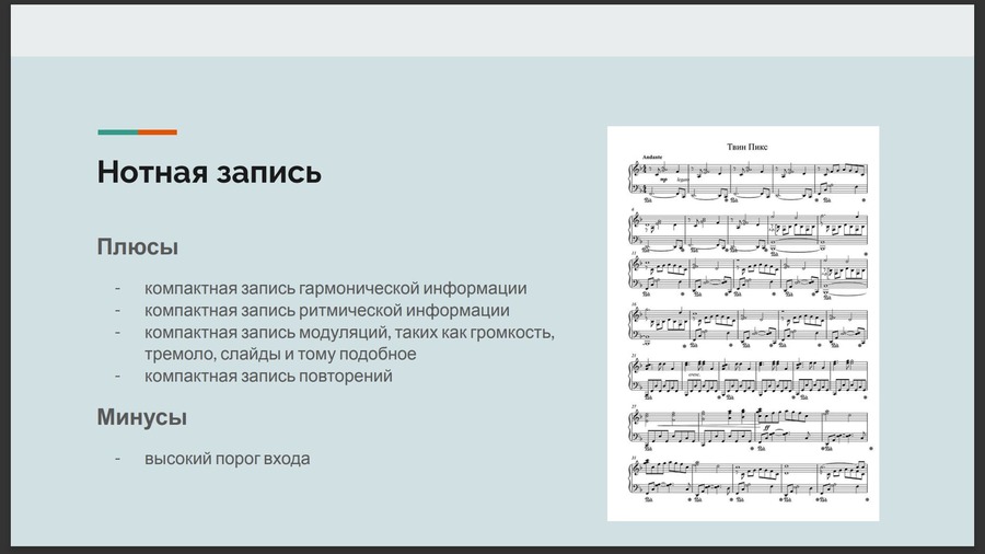 «Мы можем рассматривать музыку в виде звуковых волн, которые имеют амплитуду, частоту и прочие характеристики или можем ее рассматривать как нотный текст, который записан в определенном специфическом словаре».