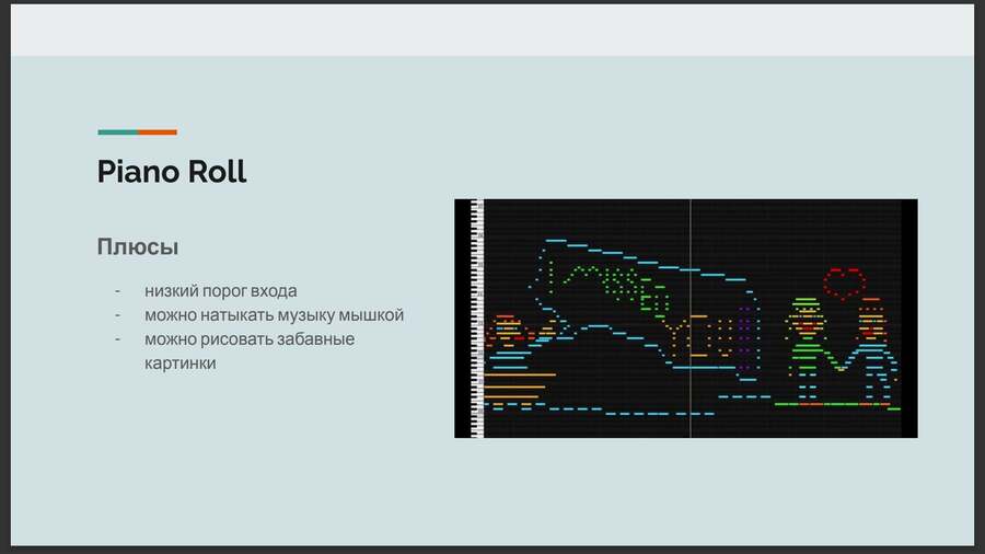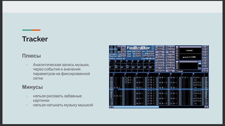 Сейчас существуют 3 вида нотной записи информации: — нотная запись, — трекерная запись, — пиано-ролл запись.