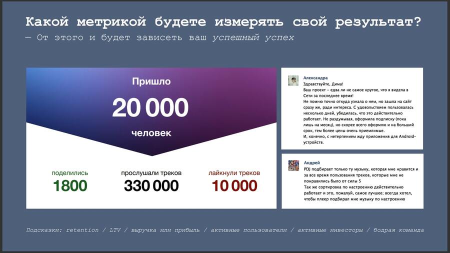 Также важны retention (сколько пользователей вернулось на сайт), лайки, реальная прибыль, инвесторы и своя команда.