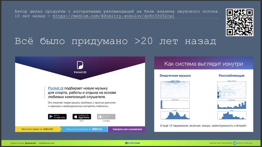 «10 лет назад я был тем человеком, кто в России первый начал продавать музыкальные рекомендации. Еще 10 лет назад я создал первый стриминговый lossless сервис, и с этим выиграл хакатон в Яндексе вместе со своей командой».