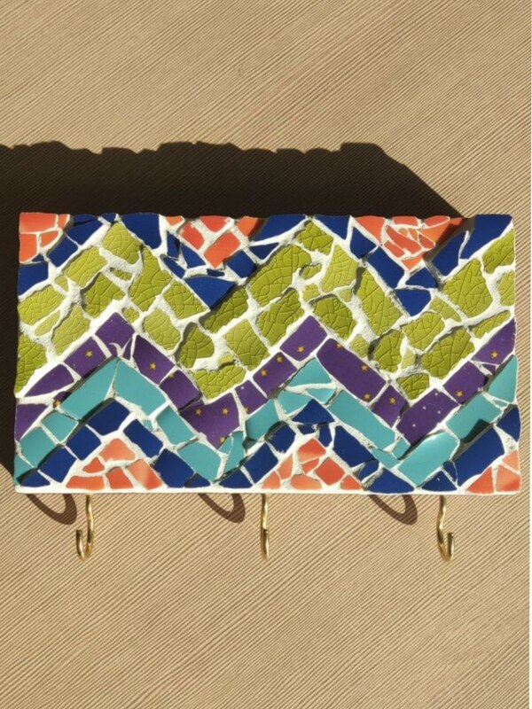 Since 2013, I created a large number of different objects, decorated with mosaics from randomly broken dishes. One of these items is this key hanger at the photo. Each piece of the mosaic was once a broken cup or plate. The base is pine. Size 18×10×2.5 cm. Made in 2024. Weight 350 gr. The hanger is placed on the wall. Hangers are provided. You can hang keys, towels, kitchen utensils and more on hooks (Weighing no more than 2 kg). Single copy. Price 10000 rub.