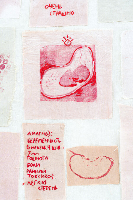 Автопортреты в технике вышивки и линогравюры посвящены рождению дочери и послеродовому периоду, проведенному в роддоме. Изображения зайчиков и мишек — это фиксация процесса отчуждения и беспомощности перед невозможностью увидеть ребенка в первую неделю.