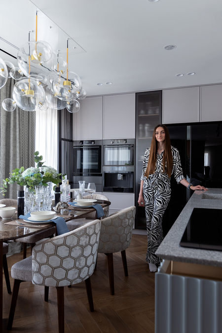 Площадь — 78 м² Количество комнат — 2 Назначение: квартира для семьи Запрос был сделать квартиру функциональную в современном стиле, под ключ. Заказчик доверился дизайнеру, все эскизы были согласованы с первого раза. Квартира изначально была достаточно хорошо спланирована, поэтому перепланировка потребовалась минимальная. За основу были взяты картины и гардероб заказчиков, проанализировав цветовую гамму и увлечения, был создан mood board и концепция. В проекте двери скрытого монтажа до потолка, дверь в кабинет скрыли шпонированными панелями, а передвижные перегородки -жалюзи добавили графичности. Кухню разделили на две части, выделили их цветом и отказались от верхних шкафов, над рабочей зоной разместили композицию из латунных молдингов. Акцентом гостиной стала обеденная группа с мягкими стульями индивидуального изготовления и стеклянная инсталляция над столом. Для уютных семейных вечеров здесь предусмотрено несколько групп осветительных приборов. Система «Умный дом» позволяет заказчику самостоятельно настроить свет под свои потребности.