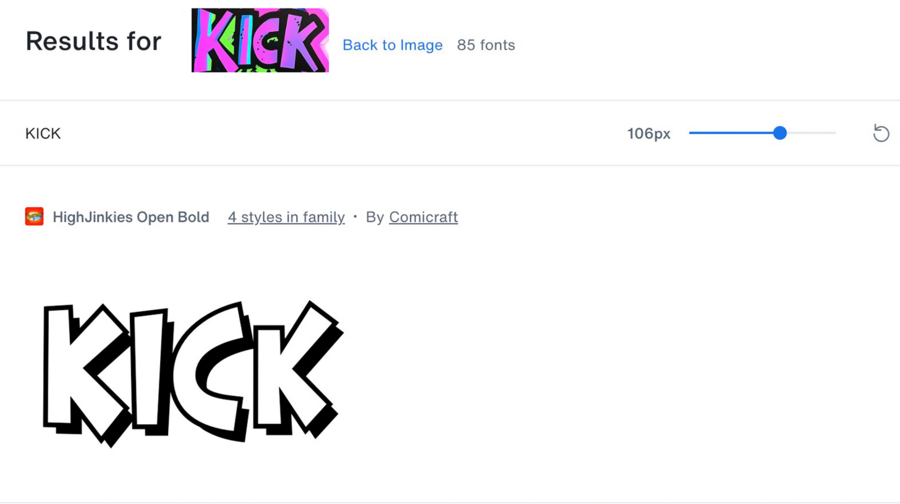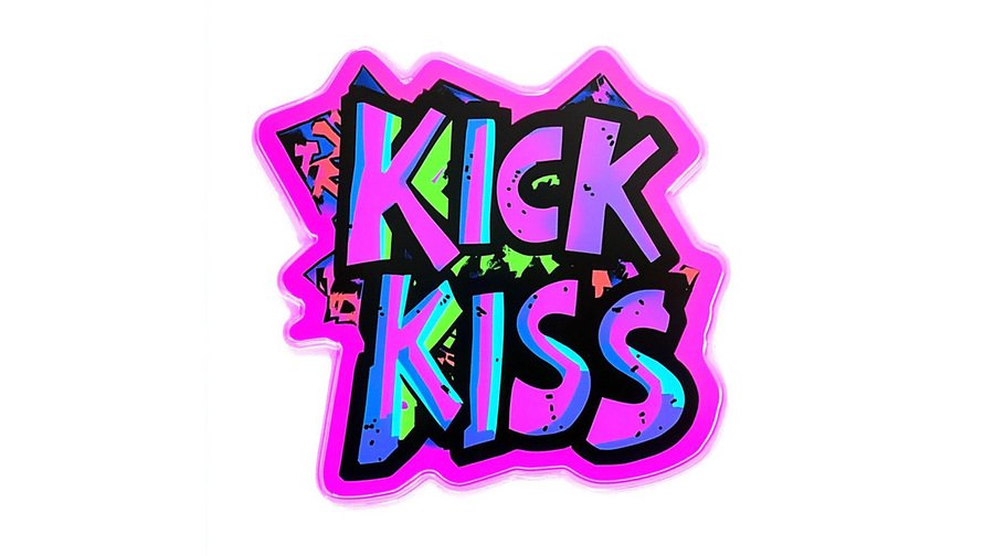 Логотип: font logo including text «KICK KISS», black, pink, blue and purple colors in a graffity sticker style и вариант шрифта, подобранный на WhatTheFont