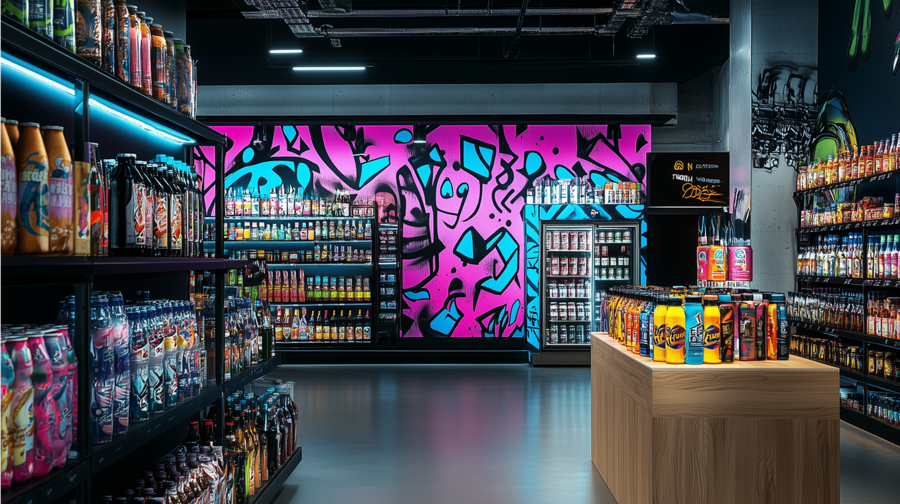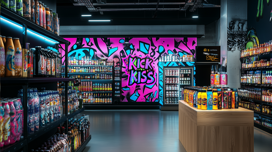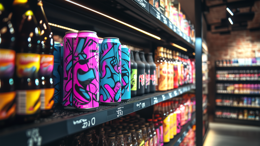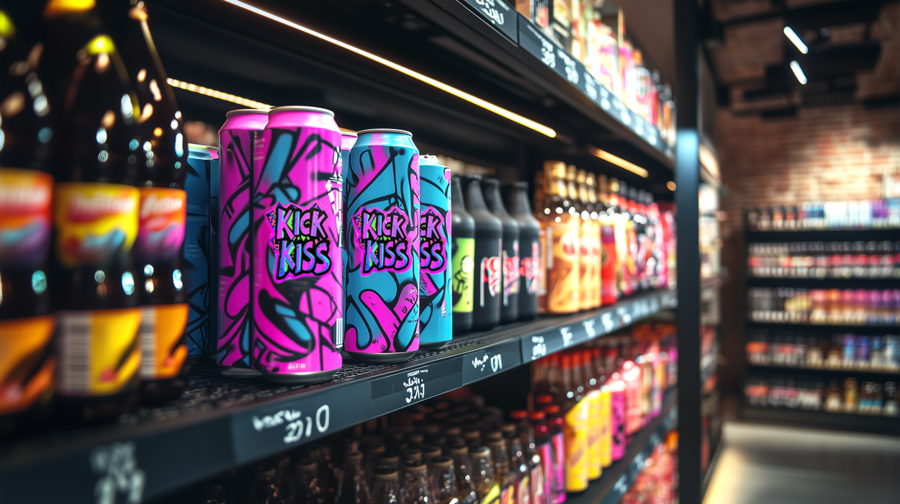 regular shelf in a store with drinks among sodas in the middle is a bright energy drink packaging in pink, blue, black colors in graffiti style --ar 16:9 --v 6.1