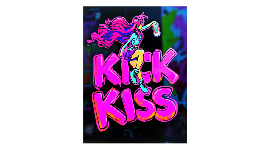 В обновлённом проекте «KICK KISS» с помощью нейросети я решила увести бренд в категорию энергетических напитков. Сконцентрироваться на заряде от вкуса, который который ощущают покупательницы, поэтому за основу стиля был выбран яркий стиль граффити
