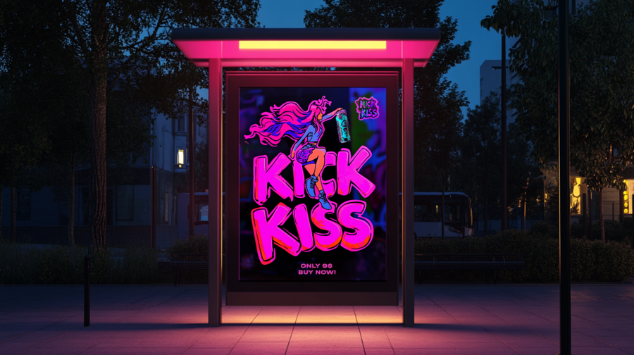 (2): graffiti style advertising poster with the words «KICK KISS» and a girl dancing with a can of energy drink in graffiti style --ar 3:4, (3) realism 4k mockup poster on evening minimalistic bkgrnd