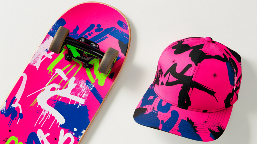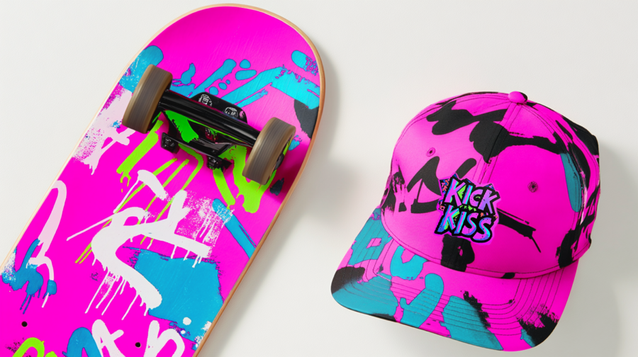 skateboard and cap with a graffiti print on white minimalistic background --sref https://s.mj.run/IaOMTofTNiQ --ar 16:9