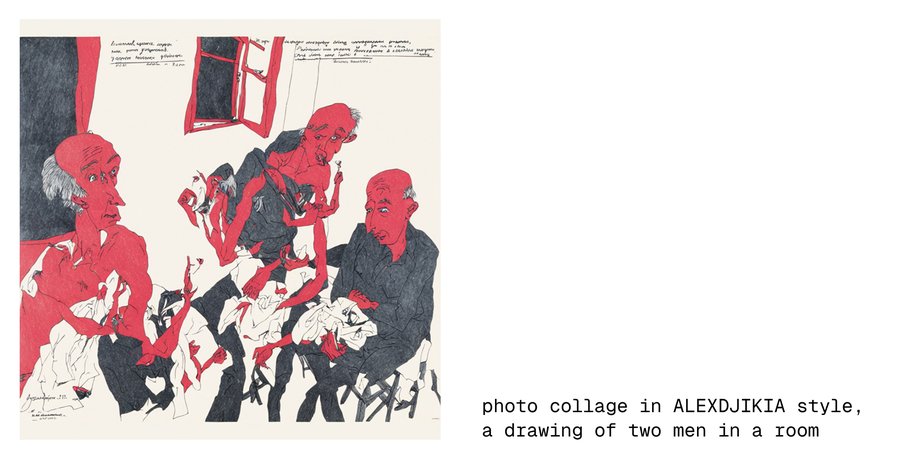 Александр Джикия — художник, который сделал собственной жизненный опыт центральной темой своего творчества. В его работах реальность переплетается с абсурдом, повседневность обретает характер театра, а сюжеты, несмотря на гротескную подачу, остаются узнаваемыми и близкими зрителю. Художник рисует рапидографом и раскрашивает работы фломастерами, часто на кальке — это объясняется как практическими, так и историко-культурными причинами. Материалы, доступные в конце 80-х — начале 90-х годов, были ограничены, и это сформировало уникальную палитру его работ: красный, синий, зелёный, чёрный.