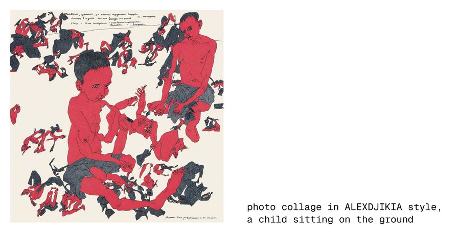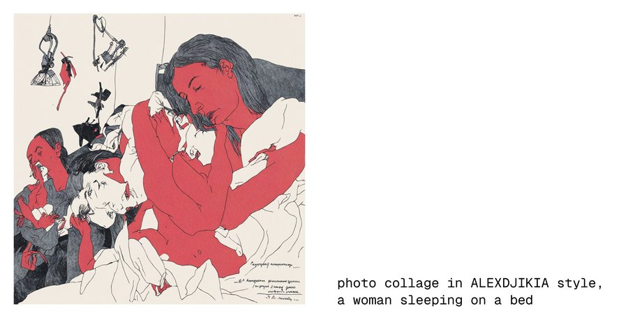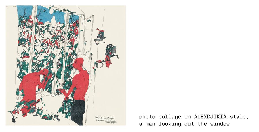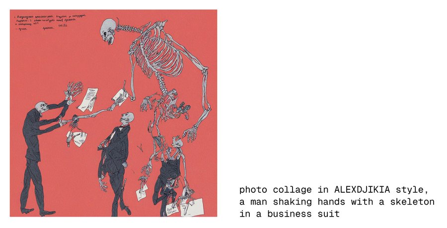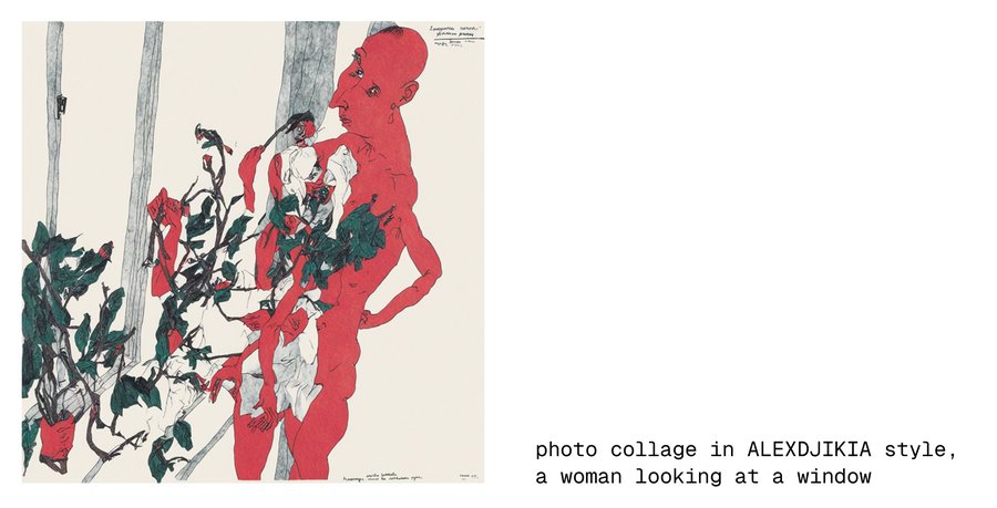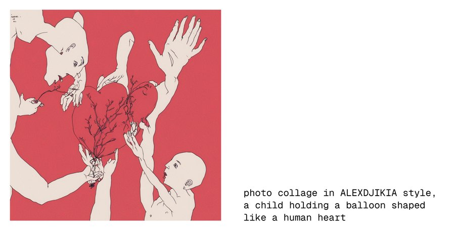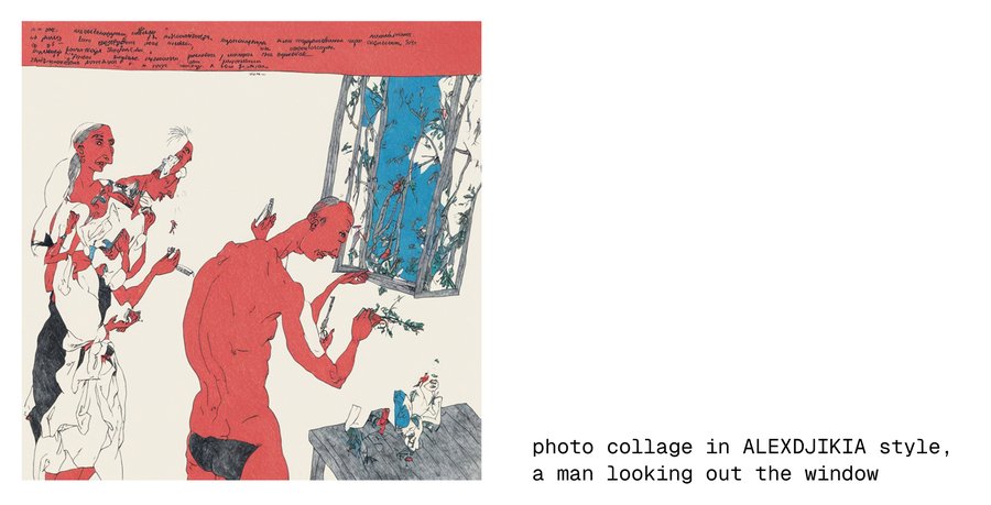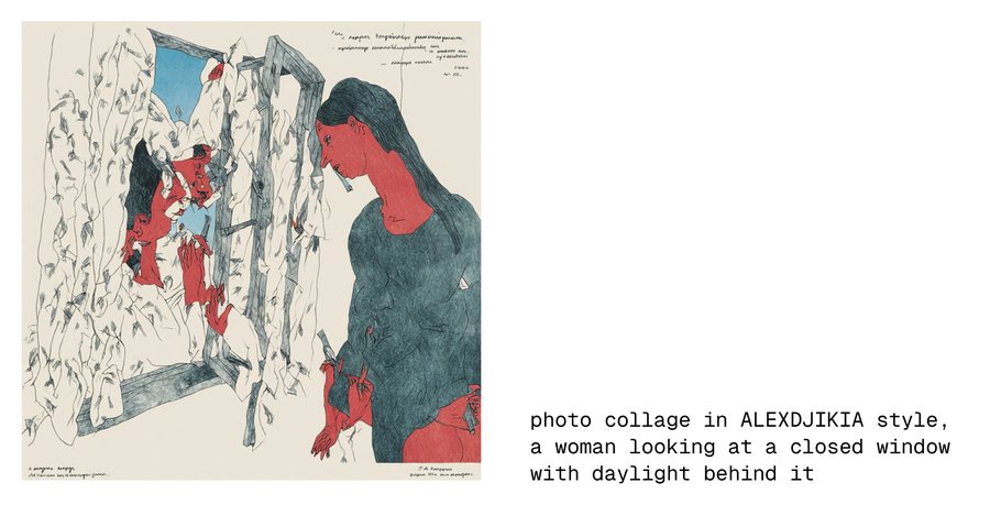 Несмотря на короткие промпты, модель в целом смогла уловить атмосферу, передать характерные силуэты и отдельные элементы, включая стилизованный рукописный текст. Однако при такой схеме генерации появляется большое количество визуальных артефактов. Модель не справляется с точной передачей пластики, пространственной логики и выразительности образов, присущих работам Александра Джикии. Короткий промпт не обеспечивает необходимой глубины, поэтому такие изображения лишь условно напоминают оригинальный стиль, не воспроизводя его в полной мере.