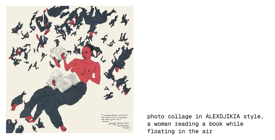 При использовании таких подробных текстовых описаний нейросеть смогла значительно точнее и детализированнее воспроизвести характерные черты работ Александра Джикии. На этом этапе стало возможным выявить достаточное визуальное сходство с авторским стилем: проработанные композиции, узнаваемая атмосфера, взаимодействие цвета и формы. Однако, несмотря на достигнутый прогресс, генерация по-прежнему сопровождается множеством артефактов. В их числе — неточности в прорисовке анатомии и мелких деталей, а также текстовые блоки, которые внешне имитируют рукописный шрифт, но остаются нечитаемыми.