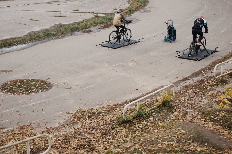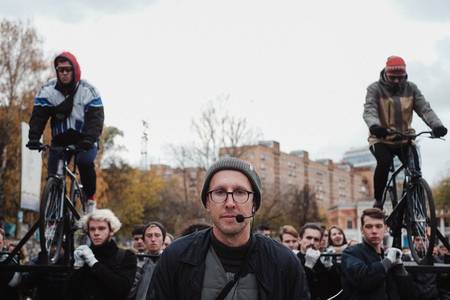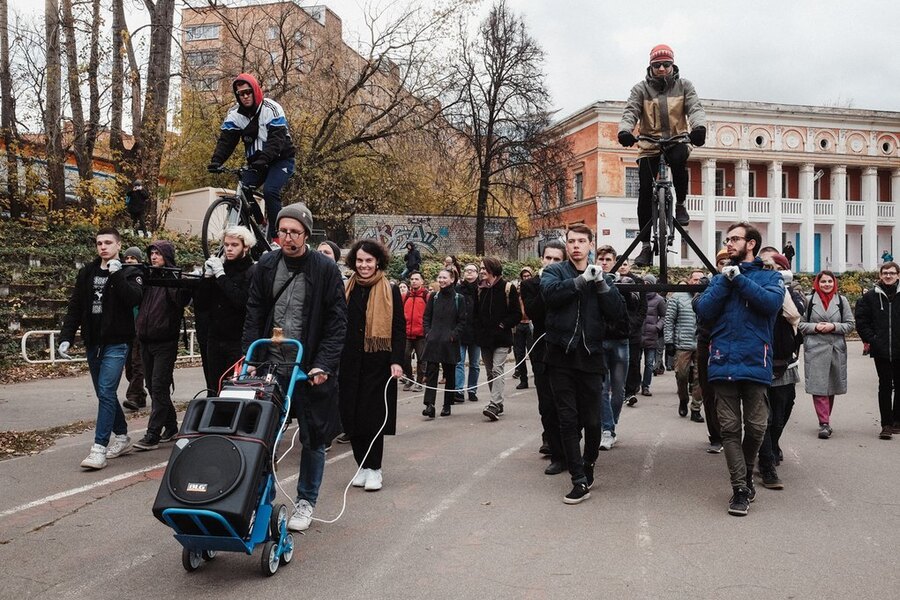 Перформанс представлял собой шествие по стадиону и соединил несколько сюжетов — зрители и перформансисты шли все вместе колонной, но внутри действия присутствовали необычные и непонятно откуда возникшие сообщества. Например, носильщики платформ, у которых довольно странная идентичность — они слаженно работают и похожи на рабочих, жрецов или на тайное сообщество. Они максимально функциональны, но, с другой стороны, их работа иррациональна. Другое микросообщество — два велосипедиста, которые прикреплены к этим платформам, крутят педали и вырабатывают ток для колонки. Чисто визуально велосипедисты находятся на вершине иерархии, есть иллюзия, что их несут, как правителей; на самом же деле они тоже трудятся, крутят педали и служат иррациональному, потому что мы идем по кругу, то есть никуда не идем.