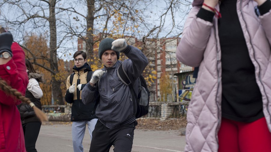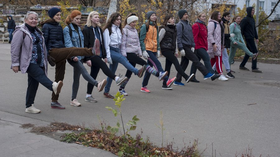 Третье сообщество — это перформеры-физкультурники, которые периодически вступали в отношения с тем, что происходило или звучало во время шествия. Они были странным, почти невозможным объединением людей, которых трудно представить за совместным делом, в данном случае — за спортивным тренингом, который их к чему-то готовит (соревнованию или, быть может, войне?).