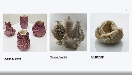 В качестве примера спикер приводит плетение корзинок из керамики, которые после обжига превращаются в различные изделия. Она подчеркивает, что процесс работы с керамикой, как и с текстилем, является непредсказуемым и увлекательным, так как в конечном итоге результат зависит от интуиции и творческого подхода дизайнера.