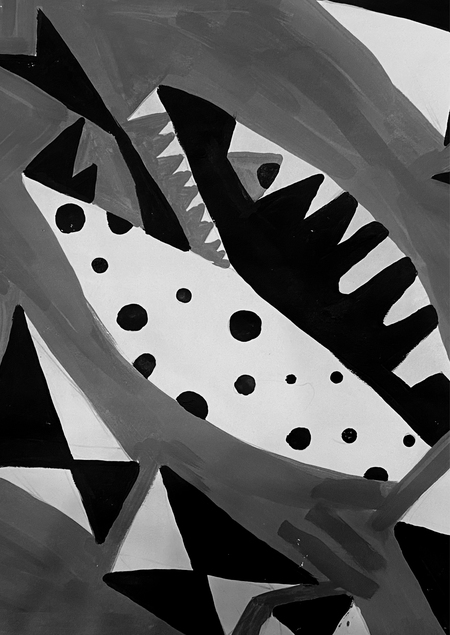 В своем проекте я отдала предпочтение трем основным цветам — черный, белый, серый, чтобы передать атмосферу сумрака и ощущение тени, в которой скрываются монстры. Также я использовала простые формы и узоры, отсылающие нас к творчеству атцеков, инков и древнейших народов мезоамерики. Работа выполнена акрилом, для создания плотной текстуры и, иногда, небрежных, рукописных геометрических фигур.