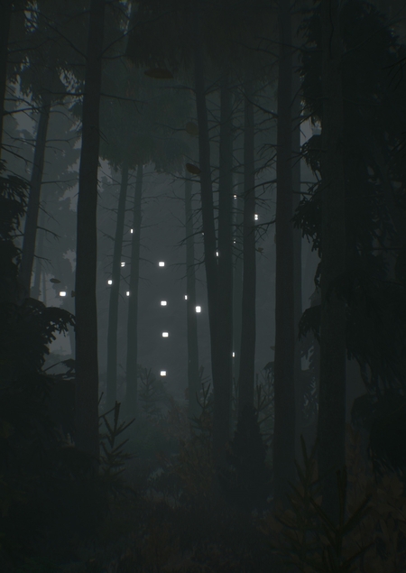 Неоновый свет рассекает туман и освещает еловый бурелом. Сквозь ветви видны заброшенные механизмы, сложенные в форме тотемов. Весь остров опутан проводами, соединяющими их.
