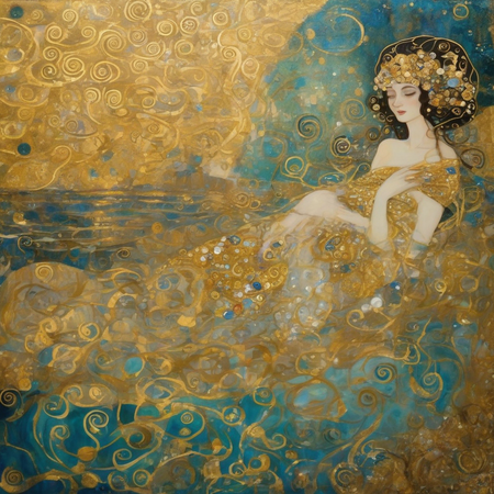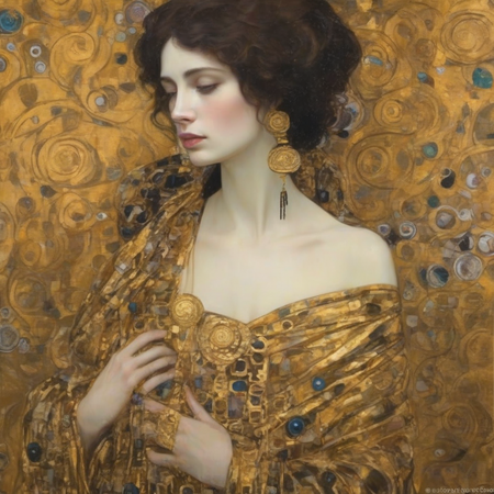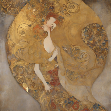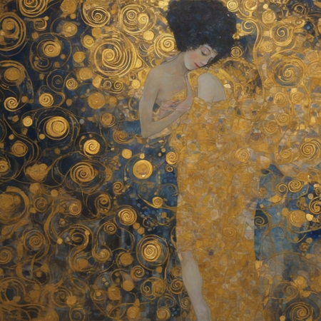 промты: «painting in Klimt style, beautiful woman draped in golden ornaments», «painting in Klimt style, book cover with elegant curves and rich textures»