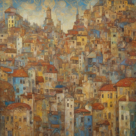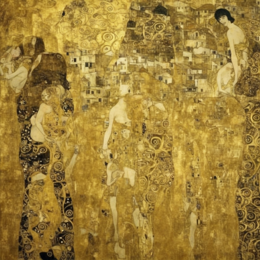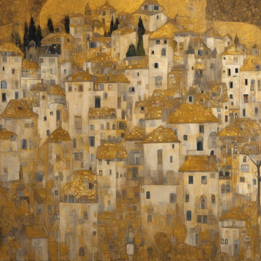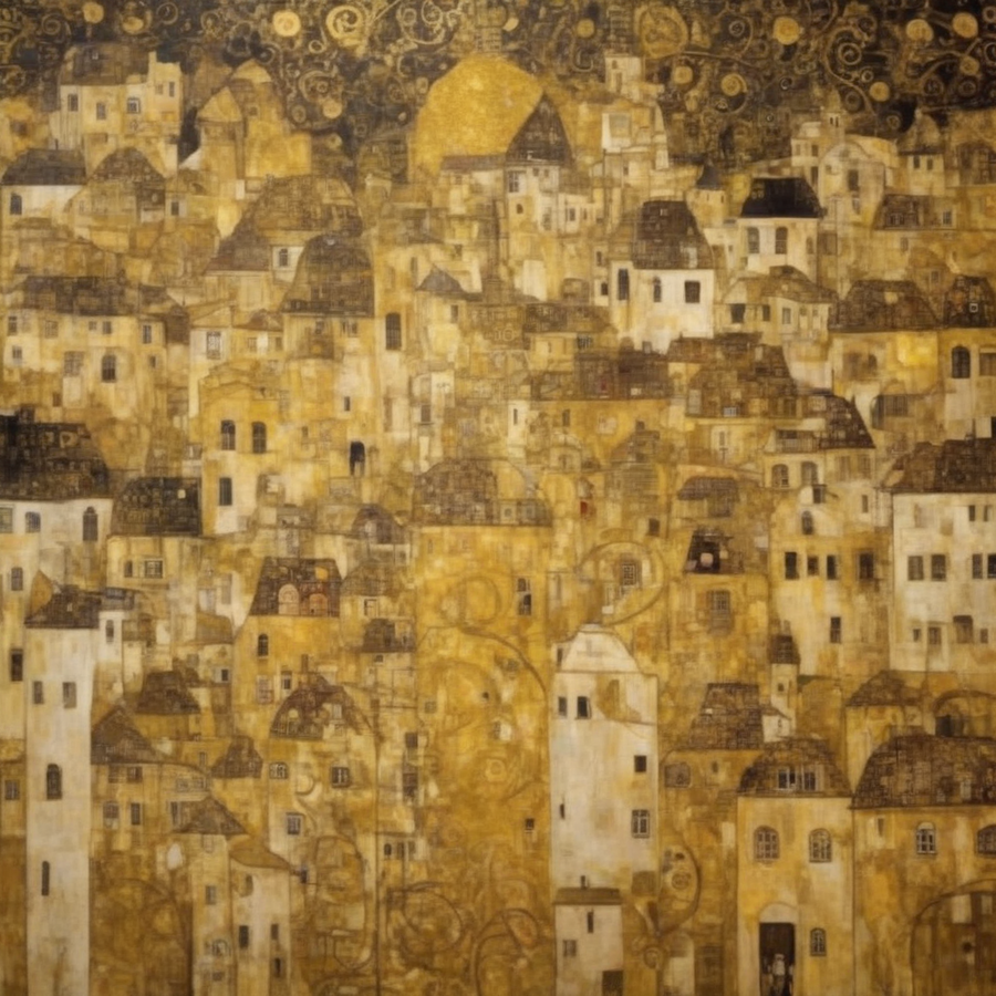 промты: «painting in Klimt style, town with golden patterns and symbolic figures», «painting in Klimt style, town of the future with ornate metallic hues»