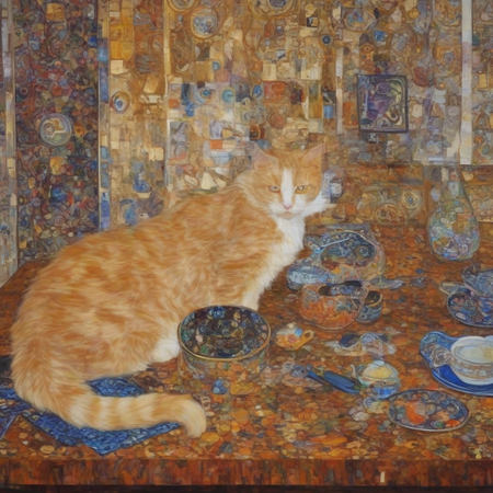 промты: «painting in Klimt style, holiday village glowing with warm golden tones», «painting in Klimt style, cat on the table in the kitchen with intricate backdrop»