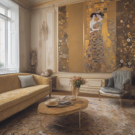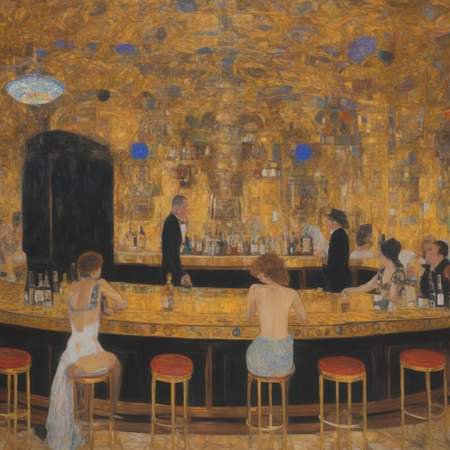 промты: «painting in Klimt style, bar with people in lavish, decorative surroundings», «painting in Klimt style, a living room in a flat with opulent detailing»